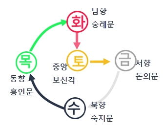 인 : 동쪽 : 흥인문(동대문) 의 : 서쪽 : 돈의문(서대문) 예 : 남쪽 : 숭례문(남대문) 지 : 북쪽 : 숙지문(북대문) 신 : 중앙 : 보신각